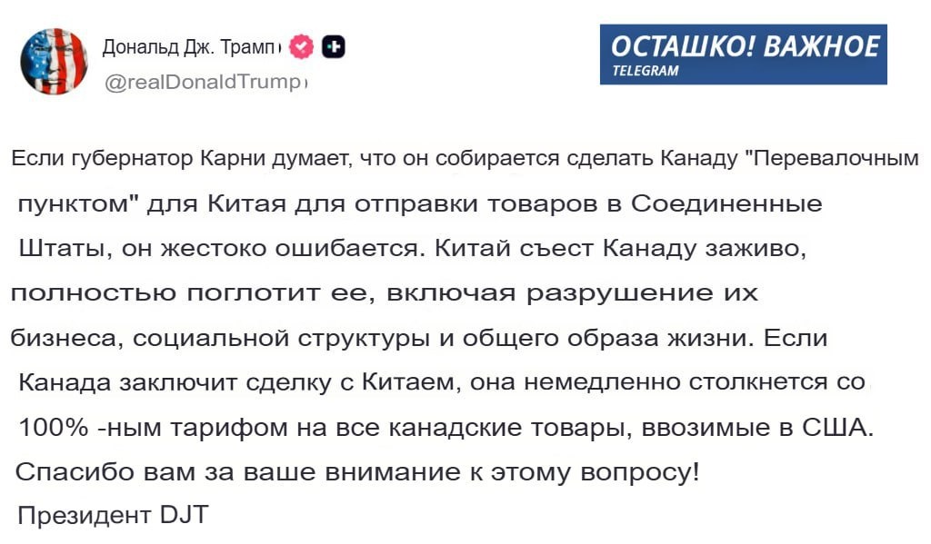 Экс‑президент США назвал премьер‑министра Канады «губернатором» и обвинил Оттаву в попытке превратить страну в транзитный узел для китайских товаров. Он предупредил: в случае сделки с Пекином Вашингтон введёт жёсткие экономические санкции, чтобы не допустить проникновения китайской продукции на американский рынок. Речь идет о 100-процентных пошлинах.