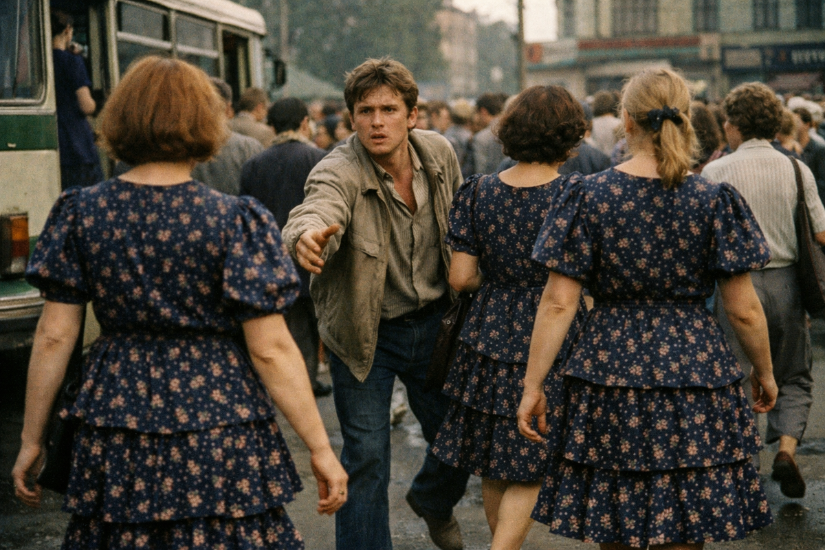 Эта история произошла в самом начале эпохи китайского ширпотреба. Точнее, в середине 80-х, когда не избалованные изобилием нарядов в магазинах, советские женщины ещё кидались на платья, которые неожиданно «выкинули» на прилавок. Качество тогда, кстати, было на высоте. Количества хватало, чтобы одеть треть города. На остановках, да и по всему городу уже на следующий день можно было наблюдать цветастые клумбочки из одинаковых, но абсолютно счастливых женщин. Как-то в городе N из-за этого произошла удивительная история. Он увидел её в забитом до отказа автобусе, зажатый между чьей-то авоськой с минтаем и суровым плечом рабочего в промасленной куртке. Она стояла в самом центре салона. Синее платье с трёхъярусной юбкой и рукавами-фонариками. Тонкий профиль. Девушка задумчиво смотрела в окно и крепко прижимала к груди папку для черчения. Один взгляд и пропал парень. Сердце ухнуло в кеды. Автобус дернулся, зашипел тормозами и остановился. Толпа хлынула на выход. А он, работая локтями изо всех