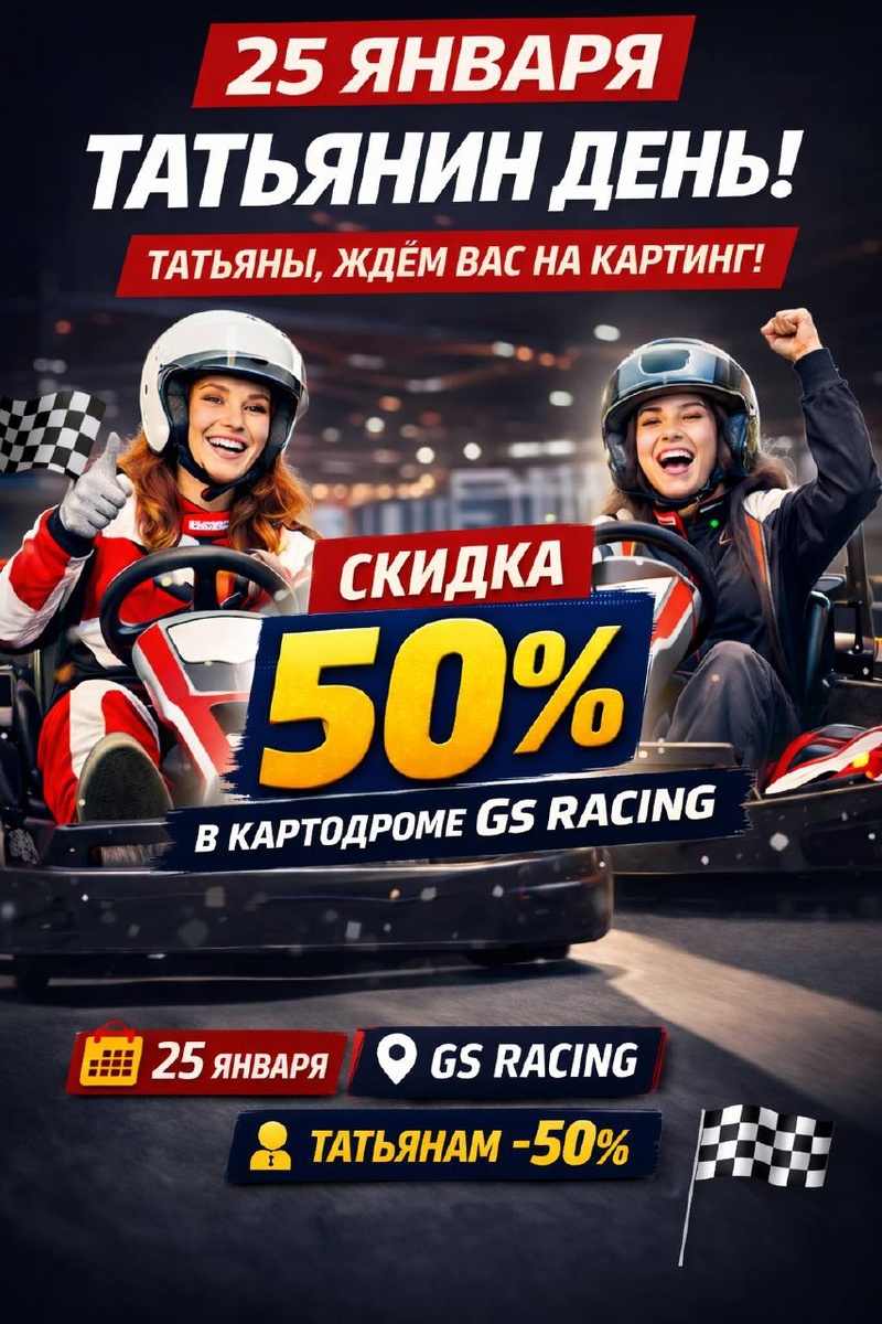! 💐🏁 И у нас есть повод нажать на газ: всех Татьян ждём на прокат в картодром GS Racing со скидкой 50% *😍 Приезжайте за своей порцией драйва, победными эмоциями и стильными кадрами. Пусть этот праздник запомнится скоростью и блеском в глазах! 🏁📸 Зовите подруг, берите компанию поддержки и приезжайте устроить свою победную гонку 🏎💨 📅 25 января 📍 Gs Racing Татьяны, кто будет самой быстрой? 😉 *Всем Татьянам необходимо взять с собой паспорт для получения супер-скидки
