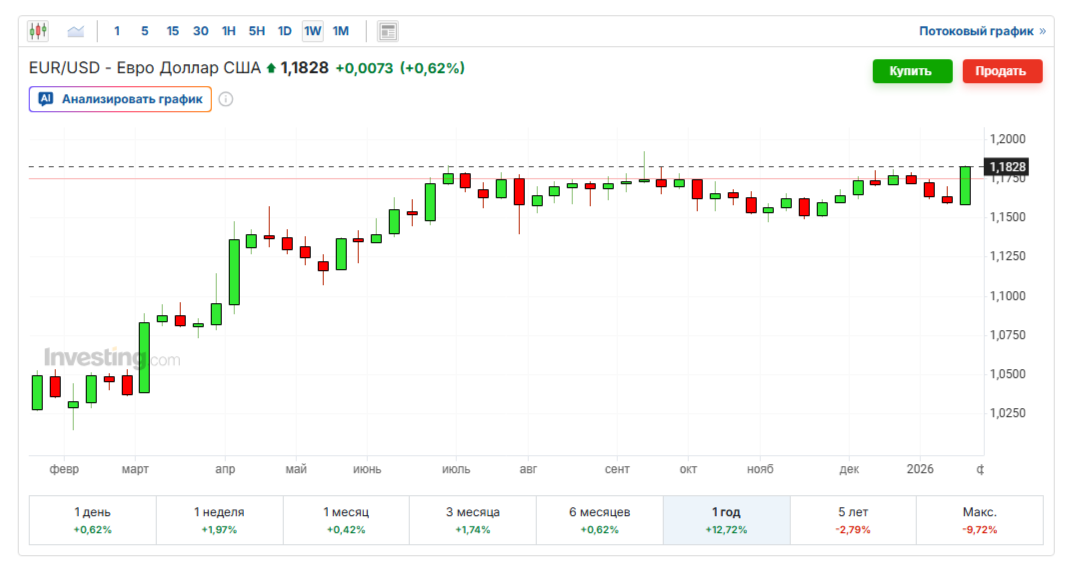 Отвечу на вопрос подписчика о своем видении тенденций по паре евро/доллар на текущий год. За последний год эта пара выросла на 13%, что очень существенно для ведущих мировых валют, и конкретно в начале 2026 года (точнее - в последнюю неделю тоже очень заметно растет. Евро укрепляется по отношению к доллару, и эта же тенденция выступает главным драйвером снижения индекса доллара, где рассчитывается его соотношение к корзине из шести мировых валют, в которой евро имеет вес более половины - 55%. График тут, как видите, будет зеркальным. Однако, в моем видении, такая тенденция скоро закончится и развернется на противоположную. И главной причиной для этого станет денежно-кредитная политика ФРС США. В 2025 году эта политика смягчалась, ставка ФРС была несколько раз понижена, что и вызвало определенное ослабление доллара к мировым валютам, в том числе и к евро. Тогда как до этого ее рост вызвал сильное укрепление, я бы сказал, переукрепление доллара. Сейчас ситуация складывается так, что ФРС