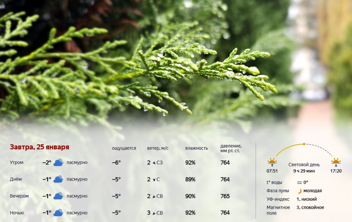 Завтра, 25 января, в Краснодаре ожидается пасмурная и прохладная погода. Утром около −2°, ощущается как −6°, слабый северо-западный ветер. Днём до −1°, без осадков, сохранится плотная облачность. Вечером и ночью температура удержится около −1°, по ощущениям до −5°. Световой день продлится 9 часов 29 минут, восход в 07:51, закат в 17:20. Температура воды 0°, УФ-индекс низкий, магнитное поле спокойное. Подробнее: https://краснодарскийкрай.рф/news/prognoz-pogody-v-krasnodare-na-25-janvarja-2026-goda.html Прогноз погоды на неделю: https://краснодарскийкрай.рф/pages/weather-forecast.html #погода #прогнозпогоды #температура #осадки #ветер #климат #метеопрогноз #краснодар #краснодарскийкрай