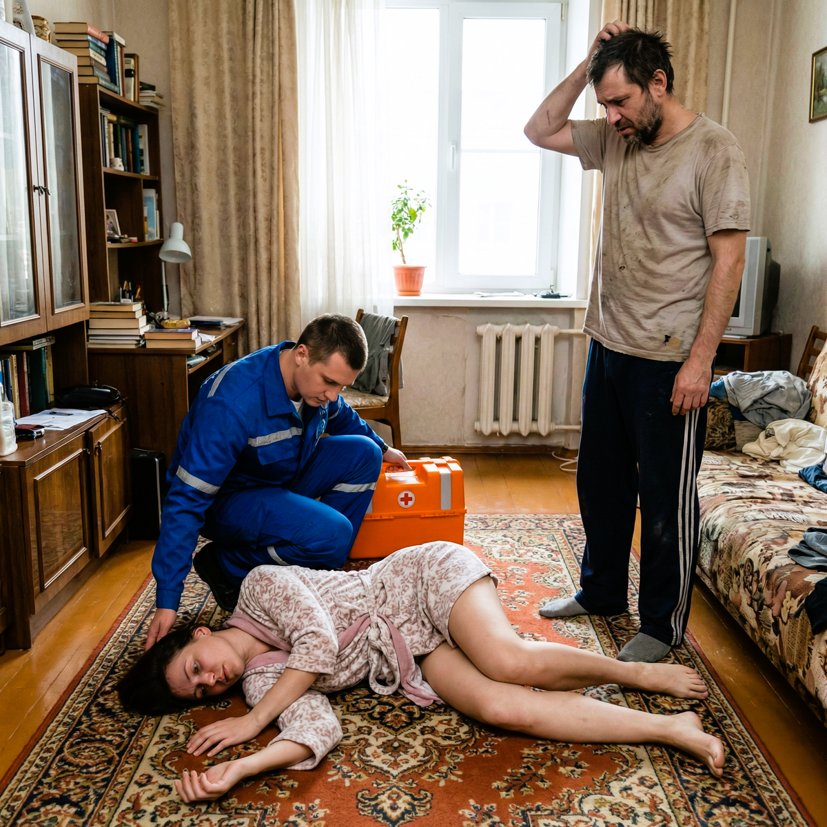 — Проходите, проходите, вот здесь, — он провёл нас в гостиную, на ходу рассказывая суть дела и стараясь не дышать в нашу сторону. — Сидели с женой, понимаете… Выпивали немного. Ну, слово за слово, поссорились. И она вдруг — бац! Упала. И начало её колбасить. И до сих пор колбасит… Она эпилептик вообще-то хроническая...