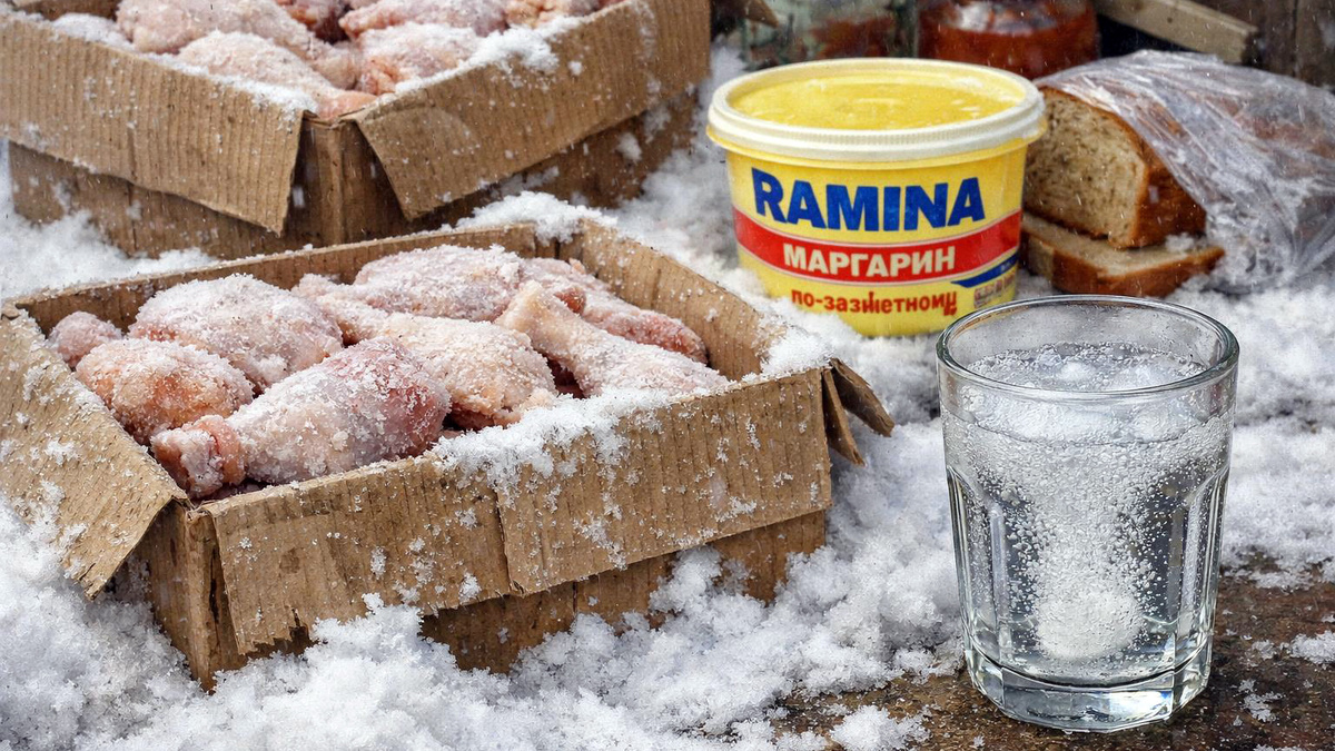 - Контекст эпохи: В условиях тотального дефицита мяса, они были либо частью гуманитарной помощи, либо продавались с лотков и машин в промёрзших коробках по 12 кг. Их разделывали, швыряя коробку об асфальт.