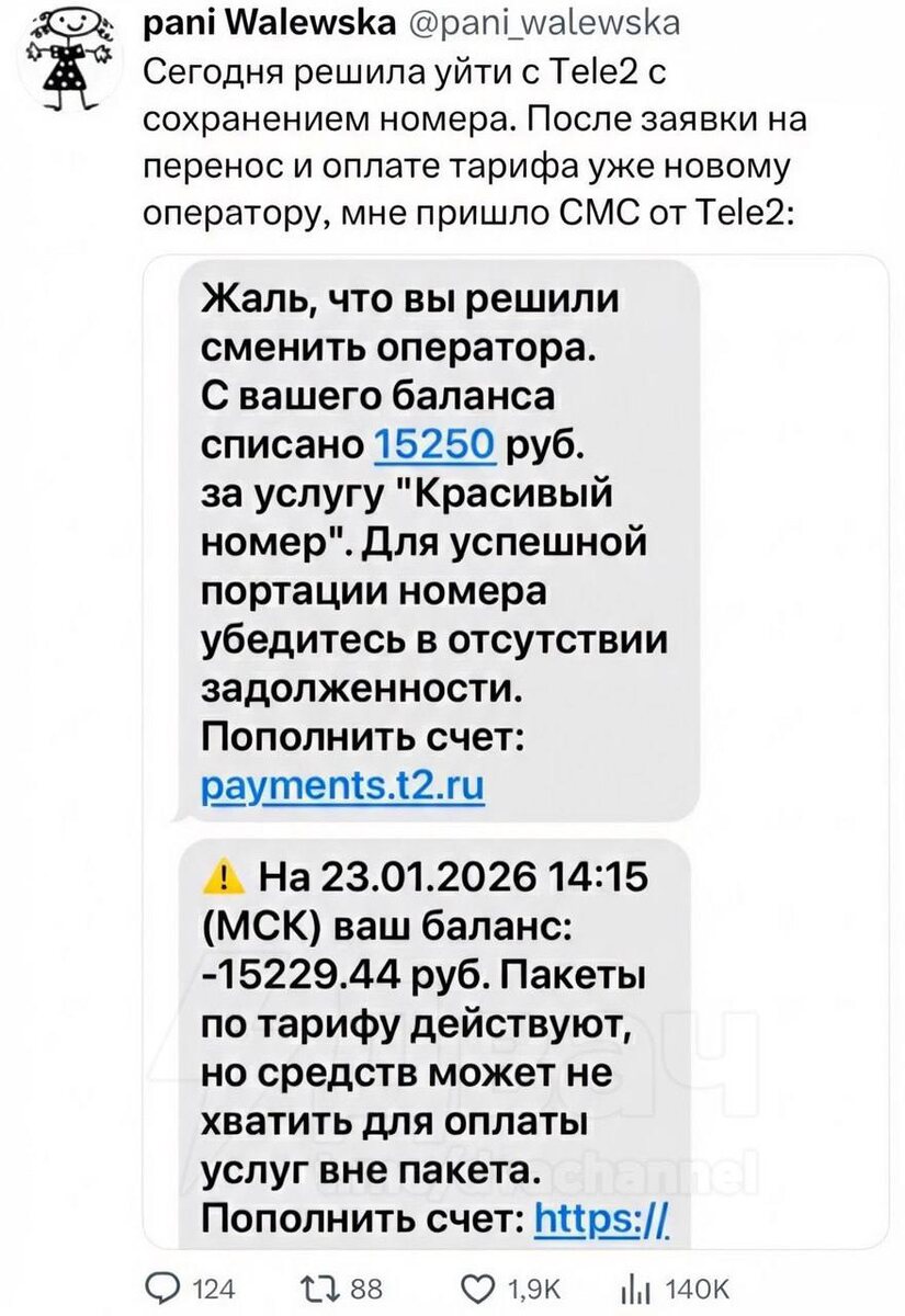 рублей за «красивый номер» при смене оператора связи, но это есть в договоре, а номер обычный 📝 Кратко: Пользователи рассказали, что оператор связи Т2 (входит в «Ростелеком») продолжает списывать по 15 тыс. рублей за «красивый номер» при смене оператора связи. Оказалось, что подобный пункт есть в договоре на обслуживание, но вот сам номер является обычным для других операторов связи. Читать далее 🔗 Читать оригинальную статью (ссылка) 📊 Источник: Habr ⏰ Время: 24.01.2026 15:04 📱 Другие каналы: 🪙 ВКрипту | 🎮 ВИгрухи | 🏎️ ВТачки | ✈️ ВТравелу #gadgets #гаджеты #технологии