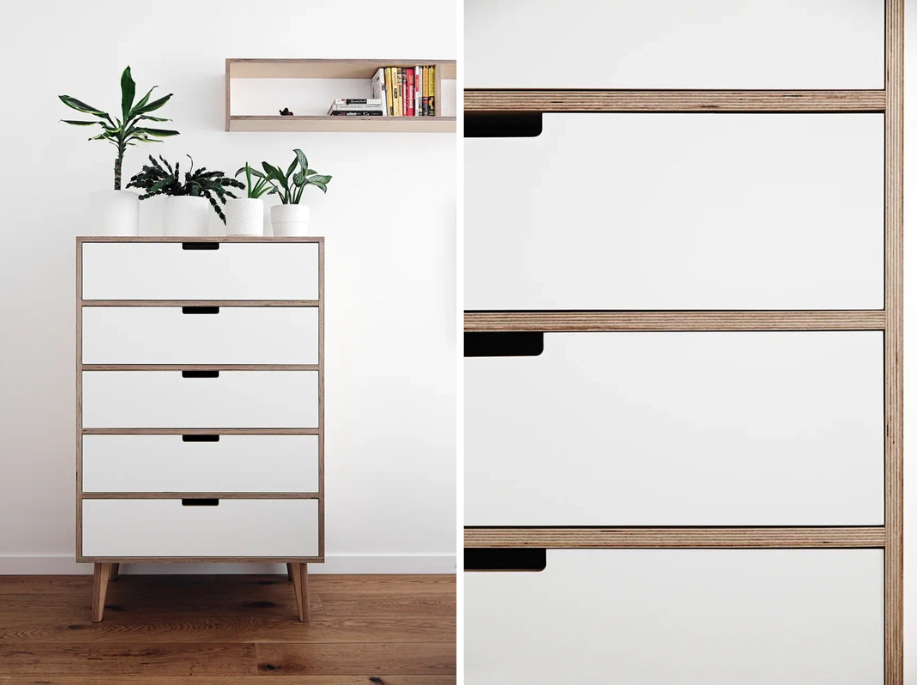Еще пять лет назад производители мебели из фанеры прятали ее узнаваемые полосатые торцы — под кромочную ленту, молдинг или хотя бы слой краски. Открытый срез воспринимался как что-то незаконченное и бюджетное. Но правила изменились — теперь его делают акцентом, ярким и харáктерным. Фанеру изготавливают из листов тонкого шпона, которые склеивают перпендикулярно друг другу. Так получается «графика» на срезе: чередующиеся слои древесины и линии клея. Только это не рисунок, а естественная конструкция материала. Ну а мы знаем, что естественный дизайн сегодня в тренде. Вот почему этот простой орнамент воспринимается интереснее, чем маскировка его под декором. Ритмичные полоски все чаще можно увидеть в дизайнерских мебельных коллекциях — по краям столов, стеллажей и полок. Это работает и потому, что современный интерьер ценит материальность — когда видно, из чего сделана вещь. Открытый фанерный торец показывает свою природу, не притворяясь массивом дерева. Новая роскошь — быть тем, что ты ест