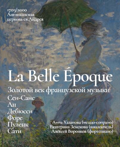 : Золотой век французской музыки. La Belle Époque (1871–1914) — это не только немые фильмы, рекламные плакаты Тулуз-Лотрека и гранд-кафе Парижа. Это период невероятного творческого расцвета, когда музыка стала звуковой тканью самой эпохи: изысканной, чувственной и полной новаторства. На стыке салонной утонченности и дерзких художественных поисков рождались новые звуки. Композиторы, словно художники-импрессионисты, смешивали музыкальные краски, стремясь передать мимолётные впечатления, оттенки чувств и поэтические образы. Центральное место программы займет вокальная и инструментальная музыка «Прекрасной эпохи»: музыка Клода Дебюсси, Габриэля Форе, Рейнальдо Ана, Камиля Сен-Санса и Эрика Сати. Исполнители: Лауреаты международных конкурсов Анна Хазанова (меццо-сопрано) Екатерина Земскова (виолончель) Алексей Воронков (фортепиано) 17 марта, 20:00 Место: Англиканская церковь Святого Андрея Адрес: Вознесенский переулок, 8/5, строение 3. БИЛЕТЫ