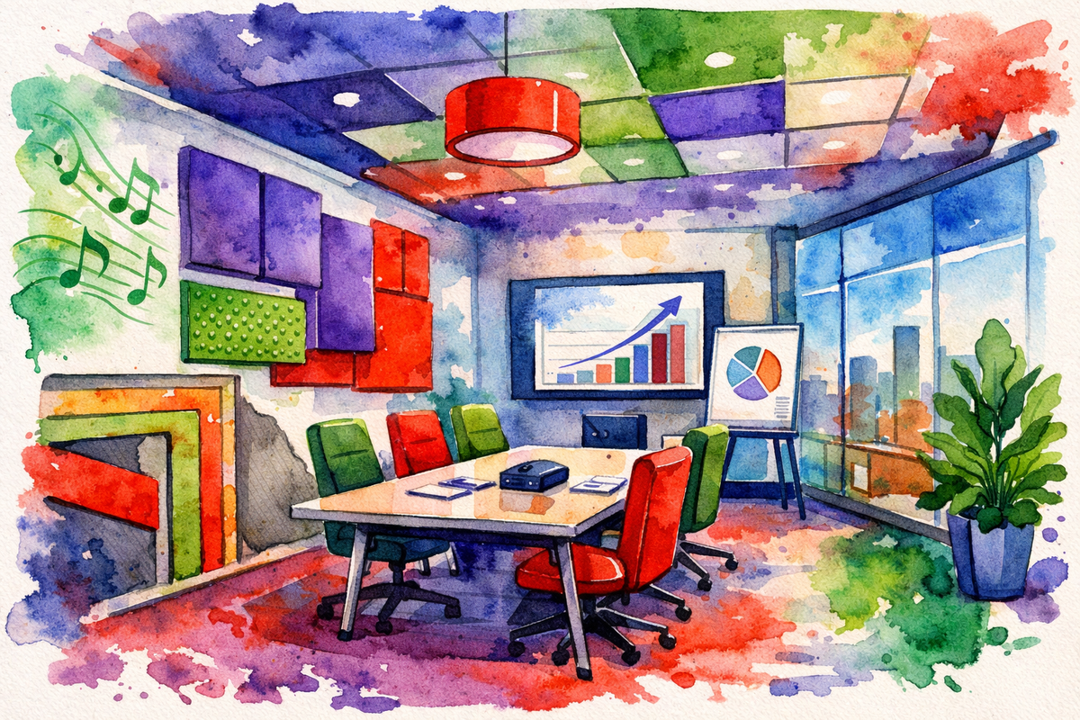 Большинство конференц-залов изначально проектируются без учёта акустики. Стеклянные перегородки, голые стены, подвесные потолки «для галочки», ламинат или плитка на полу — всё это красиво, но акустически неблагоприятно.