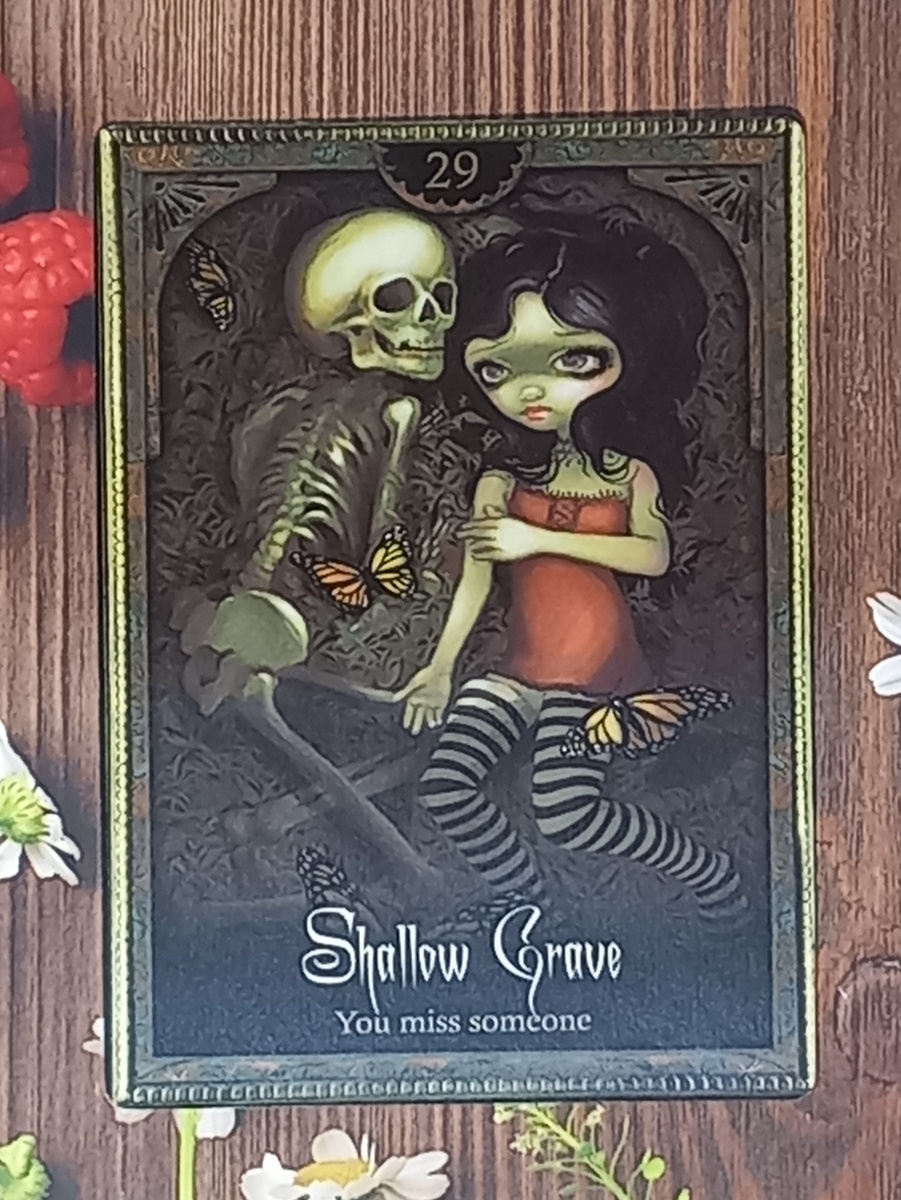 О Неглубокой Могиле : Эта красивая молодая женщина скучает по кому-то глубоко, и она знает, возможно впервые, что это такое : "потерять" кого-то. Отсутствие кого-то может быть очень тяжким. Похоже на физическую боль, и наши сердца могут действительно быть разбиты, потому что у нас, у людей, есть способность соединений, как у никого других во вселенной : мы любим, и мы любим настолько глубоко, что любовь может продолжиться, даже когда вид, который мы любили, больше не с нами. Если Вы получили эту карту в раскладе, настало время признать, насколько глубоко Вы тосковали по чьему-то возвращению, и насколько их потеря затронула Вас. Здесь есть глубокая печаль, и она не может быть ослаблена, даже если отрицать её присутствие. И как только это будет сделано, Вы можете дать им отдохнуть и время от времени посещать их, но знать, что Вы