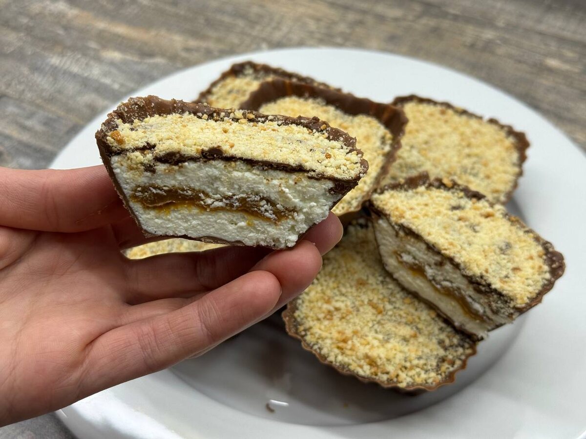 Я люблю делать домашние десерты, и эти сырки в шоколадной глазури — один из тех рецептов, которые прижились сразу. Готовлю их без спешки, из понятных продуктов и всегда знаю, что внутри. По вкусу они получаются нежными, сливочными, с ярким шоколадным слоем и приятной сладкой начинкой. Такие сырки спокойно можно предложить и детям, и взрослым — они не приторные и отлично хранятся в морозилке. Сначала я занимаюсь творожной массой. В миску выкладываю творог, добавляю мягкое сливочное масло и сахарную пудру. Всё тщательно перемешиваю до однородности. Чтобы сырки получились действительно нежными, обязательно протираю массу через сито. После этого она становится гладкой, кремовой и очень приятной по текстуре. Далее перехожу к шоколаду. Ломаю его на кусочки и растапливаю на водяной бане, постоянно помешивая. Важно не перегревать шоколад, чтобы он остался гладким и блестящим. Силиконовые формы аккуратно обмазываю растопленным шоколадом, распределяя его по дну и стенкам. Делаю слой чуть плотне