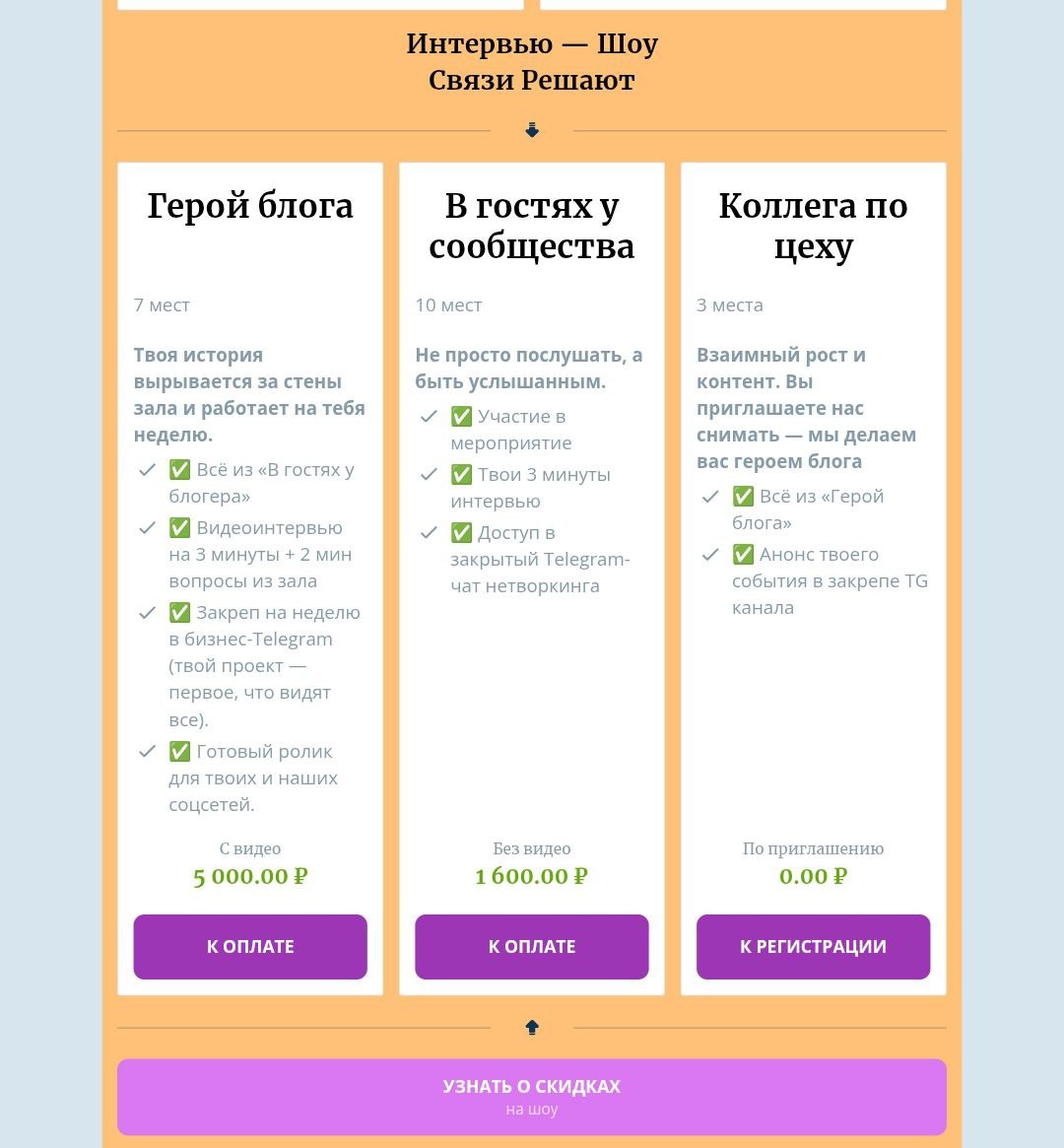 Всё идёт по плану. Мы на финишной прямой перед большим премьерным шоу «Связи решают»! Это будет глобальное шоу: прямой эфир одновременно на нескольких площадках, публикации, живое взаимодействие. Настоящее событие с комплексным пиаром в B2B сигменте. И у вас есть последний, исключительный шанс: 📅 26 января — последний день, когда можно успеть присоединиться по единому стартовому тарифу. Уже всё готово к переходу на новую цену. На Taplinke уже цены для 2 февраля. Наша главная цель не кол во людей, у нас даже не будет спикеров. Наша главная цель создать качесвенную B2B тусовку. Со 2 февраля стартуют новые условия, но и начинают действовать специальные скидки для нашего комьюнити: • 50% — для героев моих интервью на бизнес событиях (действует 3 недели после съемки). • 30% — по приглашению от друга или сообщества. • 50% — для тех, кто придёт повторно по уже знакомому тарифу (действует бессрочно*). Ждём всех в ближайший понедельник на последнюю встречу по единому тарифу. Это в