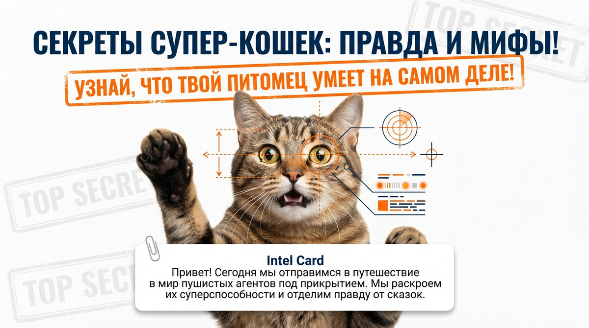 Привет всем! Сегодня мы отправимся в удивительное путешествие в мир наших пушистых и иногда загадочных друзей — кошек! Мы узнаем, какие у них есть настоящие суперспособности, скрытые от наших глаз, и разберемся, где правда, а где — просто сказки и мифы. Готовы? Тогда начинаем! Давайте начнем с самого начала. Ваш домашний Мурзик или Барсик — это настоящий хищник! Его самый близкий родственник — это африканский дикий кот, и они почти не отличаются внешне. А если копнуть глубже в семейное древо, то окажется, что все кошки, от вашей домашней до царя зверей льва, принадлежат к одному семейству. Так что дома у вас живет маленький, но гордый хищник! Посмотрите на уши кошки! Это не просто украшение. Каждое ухо управляется 32 мышцами (у человека их всего 6!) и может независимо поворачиваться, чтобы точно ловить малейший шорох. А главное — они слышат звуки, которые для нас тишина. Например, ультразвук, которым общаются мыши и летучие мыши. Для кошки мышиный разговор — как для нас громкая речь!