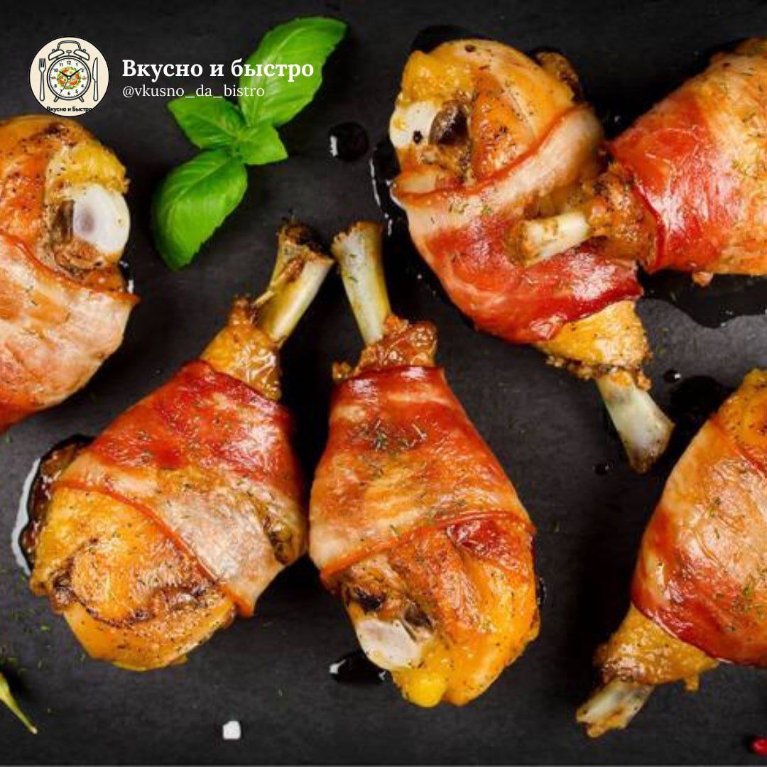 #обед #ужин #30мин 🕒Время приготовления: ~30 минут Порции: 6 шт. Сложность: легко 🧾 Ингредиенты: 🟠Куриные голени — 6 шт. 🟠Бекон — 6 ломтиков 🟠Соус барбекю — 2 ст. л. 🟠Соль, чёрный перец — по вкусу 🍴Приготовление: 1. С куриных голеней снимите кожу, аккуратно очистите нижнюю часть косточки ножом. 2. Смажьте голени соусом барбекю, посолите и поперчите по вкусу. 3. Каждую голень плотно оберните ломтиком бекона. 4. Выложите голени в форму для запекания. 5. Запекайте в разогретой до 180 °C духовке около 30 минут до румяной корочки. Вкусно и Быстро | Мы в Мах 📲