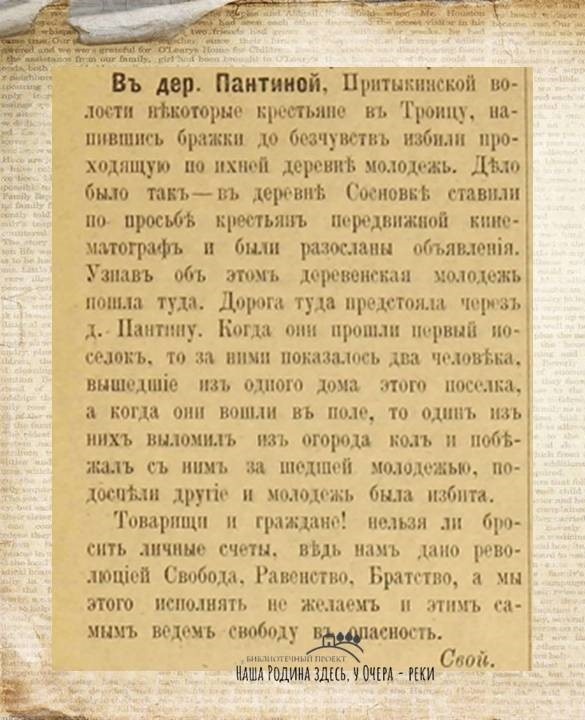 Источник: Народное свободное слово.- 1917.- 7 июяя В деревне Пантиной Притыкинской волости произошел инцидент. Несколько крестьян, находясь в состоянии сильного алкогольного опьянения, избили проходящую мимо молодежь. Инцидент произошел следующим образом: в деревне Сосновке по просьбе местных крестьян был организован передвижной кинотеатр, о чем были распространены объявления. Узнав об этом, деревенская молодежь отправилась туда. Путь лежал через деревню Пантину. Когда они прошли первый поселок, за ними из одного дома вышли двое мужчин. Войдя в поле, один из них выломил из огорода кол и побежал с ним за молодежью. Вскоре к нему присоединился второй мужчина, и молодежь была избита. Товарищи и граждане! Не пора ли отбросить личные счеты? Революция даровала нам Свободу, Равенство и Братство. Однако мы не стремимся воплотить эти идеалы в жизнь, тем самым подвергая свободу опасности. Свой.