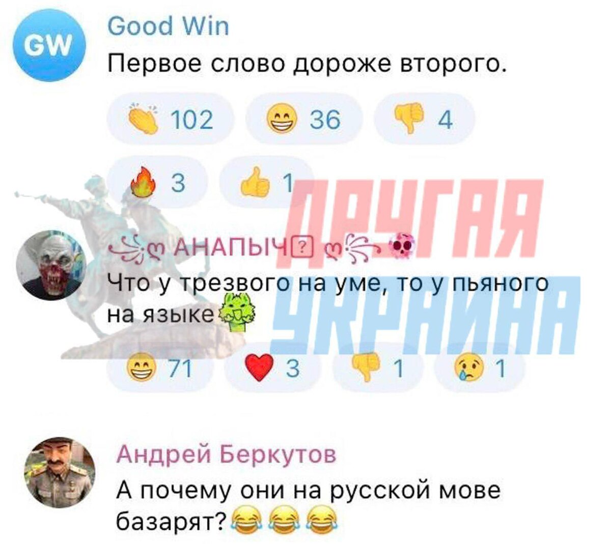 — Скажи пару слов для прессы! — Слава России! — Шо-шо? — Ой, слава Украине! Украинские паблики взорвались комментариями вроде этих: «Первое слово дороже второго» «Что у трезвого на уме, то у пьяного на языке» «А почему они на русской мове базарят?» Сайт "Другая Украина" / Telegram / Вконтакте / Центр поддержки Украинцев / Жалоба на ТЦК "Другая Украина" теперь в МАХ