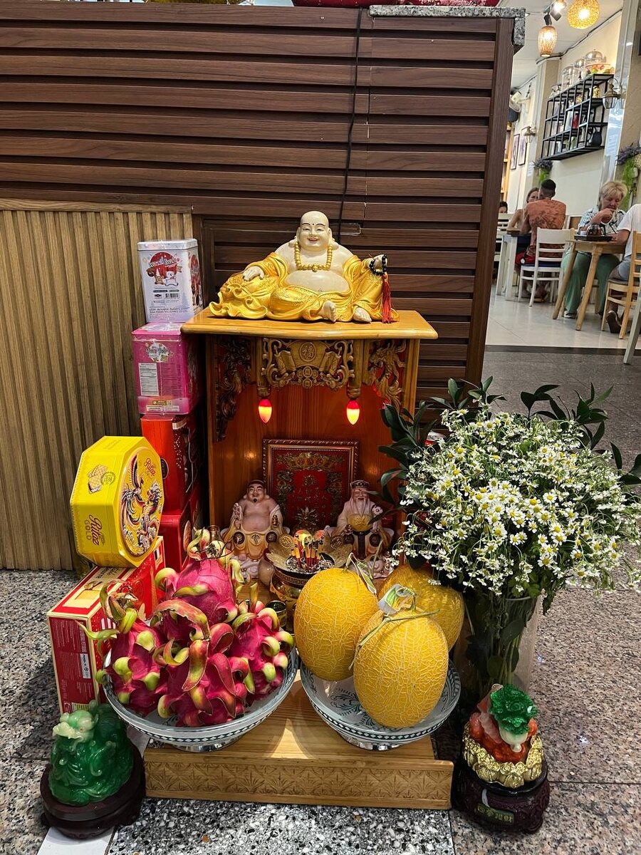 😻 в кафе, в магазинах неважно большой или маленький , отели да в целом на каждом шагу. Здесь стоит алтарь с подношением. Там всегда горят свечи и горит аромапалочка / они пристально за этим следят и смотрят / До мурашек просто. Вызывает внутри такое чувство восхищения и кайфа внутри. Я ликую когда вижу это 🪐