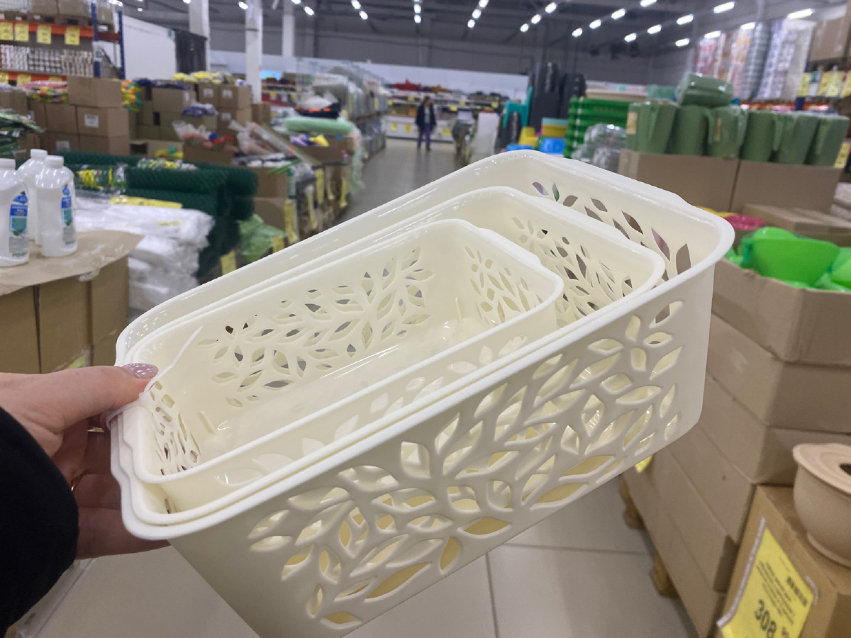 В наличии есть наборы пластиковых корзин Leaves. В этом наборе 3 корзины разного размера. Они ажурные. В составе полипропилен. Изготовитель Россия. Цена 268 рублей.