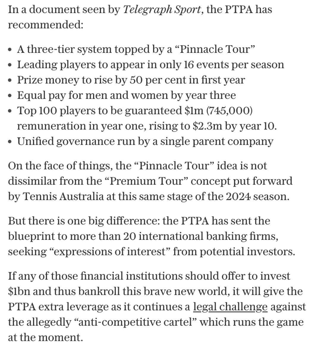 » В документе, который видел Telegraph Sport, PTPA рекомендует: • Трехуровневую систему во главе с «Пинакл-туром» • Ведущие игроки будут выступать только в 16 турнирах за сезон • Призовые вырастут на 50% в первый год • Равная оплата для мужчин и женщин к третьему году • Гарантированные $1 млн (745 тыс.) в год для топ-100 игроков в первый сезон, с ростом до $2,3 млн к 10-му году • Единое управление под контролем единой материнской компании На первый взгляд, идея «Пинакл-тура» похожа на концепцию «Премиум-тура», предложенную Теннисной Австралией в начале сезона-2024. Но есть одно большое отличие: PTPA отправила план более чем 20 международным банкам, ищущим инвесторов. Если хотя бы один из этих финансовых институтов предложит инвестировать $1 млрд и профинансирует этот смелый новый мир, это даст PTPA дополнительные рычаги в продолжающемся юридическом противостоянии с теми, кто, по их мнению, управляет теннисом как «антиконкурентный картель». Подпишись на Эйс и точка