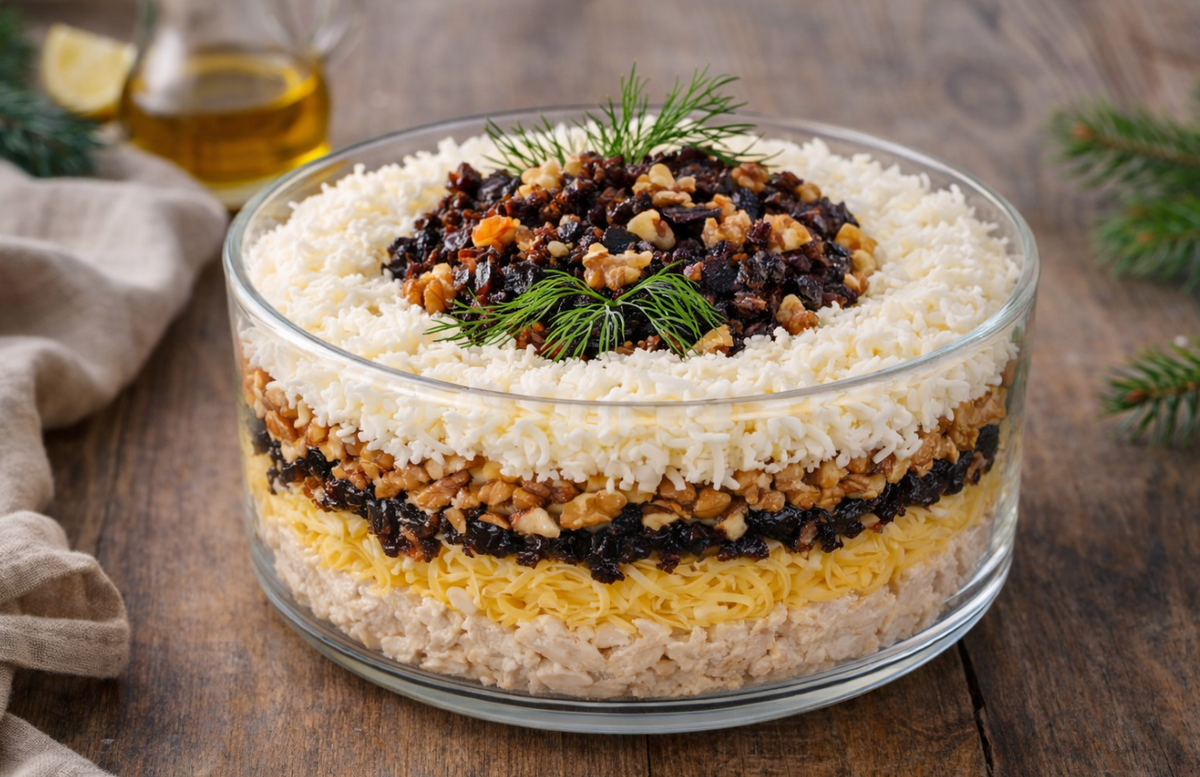 Этот салат сметают самым первым — он невероятно нежный и сочный, с выразительной сладкой ноткой чернослива, ароматом чеснока и приятным хрустом орехов. Выглядит празднично и эффектно, а вкус покоряет с первой же вилки. Куриный салат с черносливом и чесноком — фаворит любого застолья. • Куриное филе (отварное) — 300-350 г • Яйца варёные — 4 шт. • Чернослив — 100 г • Грецкие орехи — 150 г • Твёрдый сыр — 100 г • Чеснок — 2-3 зубчика • Майонез — 100 г 1. Куриное филе отварить в подсоленной воде, остудить и мелко нарезать. Смешать с 1 ст. л. майонеза и чесноком, пропущенным через пресс. 2. Яйца разделить на белки и желтки, натереть их отдельно на мелкой тёрке. 3. Чернослив промыть, хорошо обсушить и мелко нарезать. Орехи крупно порубить (немного оставить для украшения). Сыр натереть на мелкой тёрке. 4. Установить кулинарное кольцо на блюдо и выложить слоями: • 1-й слой — курица с чесноком, слегка уплотнить • 2-й слой — сыр (не утрамбовывать), сверху сеточка майонеза • 3-й слой — чернос