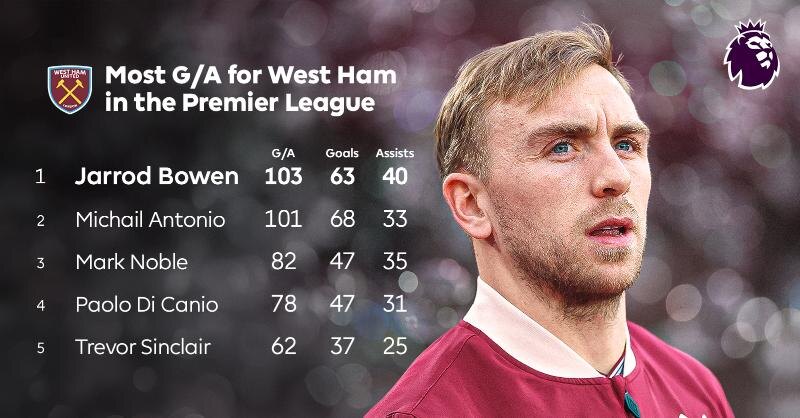 Джаррод Боуэн стал рекордсменом "Вест Хэма" по количеству результативных действий за клуб в Премьер-Лиге — 103 (63 гола + 40 "ассистов") 🔝