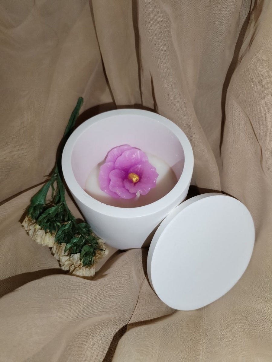 Эту свечу я делала для очень нежного, ранимого и скромного человека... Так как пожеланий в оформлении не было, за исключением формы подсвечника, мне захотелось внести в образ свечи ту мягкость, нежность и скромность, которые я вижу в человеке, усилить такой дизайн мягкими светлыми и/или нежными оттенками. С учётом того, что дизайн был выбран максимально простой, я решила добавить уюта и мягкости