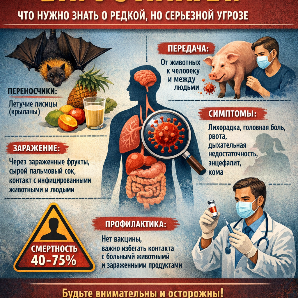 В последнее время в новостных лентах всё чаще мелькает название «Нипах» (NiV). Пока одни пугаются заголовков о «новой пандемии», ученые призывают к спокойствию, но бдительности. Давайте разберемся, что это за вирус на самом деле и стоит ли нам беспокоиться. Вирус Нипах — это зоонозный вирус, то есть он передается человеку от животных. Его естественными носителями в природе являются плодоядные летучие лисицы (крыланы). Впервые вирус был замечен в 1999 году в Малайзии среди фермеров, разводивших свиней. Вирус не летает по воздуху так легко, как грипп или COVID-19. Заражение происходит тремя путями: Болезнь коварна тем, что поначалу напоминает обычную простуду: лихорадка, головная боль, боль в мышцах, рвота и боль в горле. Однако в тяжелых случаях вирус может вызвать отек мозга (энцефалит) или острые респираторные проблемы. Важный факт: Летальность вируса Нипах оценивается Всемирной организацией здравоохранения в пределах от 40% до 75%. Именно поэтому ученые так внимательно следят за кажд