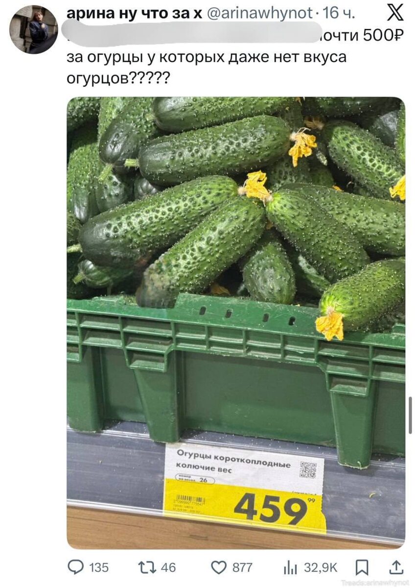 Обычные короткоплодные огурцы уже стоят дороже 500 рублей за килограмм, из-за чего россияне начали массово отказываться от овоща. А вы часто покупаете огурцы? 👍/👎 📲 Читайте нас в MAX 👍 Подписаться на канал | Прислать новость