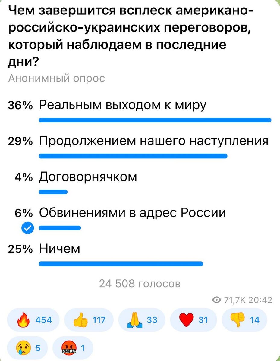 ⚡️⚡️⚡️ 36 процентов подписчиков считают, что переговоры действительно приведут к миру. Вопрос лишь в том, сколько он продержится.