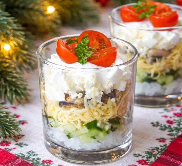 ИНГРЕДИЕНТЫ: ✅ Огурец — 80 г ✅ Сыр твёрдый — 40 г ✅ Яйцо куриное — 1 шт. ✅ Мидии в масле — 16 шт. ✅ Рис — 2 ст. л. ✅ Помидоры черри — 6 шт. ✅ Майонез — по вкусу ✅ Соль — по вкусу ПРИГОТОВЛЕНИЕ: 1. Рис отварить согласно инструкции, полностью остудить. Выложить первым слоем в стакан. 2. Огурец нарезать мелкими кубиками и выложить вторым слоем. 3. Сыр натереть на мелкой тёрке, выложить поверх огурца. 4. Добавить слой мидий. 5. Яйцо отварить вкрутую, остудить, мелко нарезать и выложить следующим слоем. 6. Посолить по вкусу, заправить майонезом. 7. Украсить половинками помидоров черри. ПРИЯТНОГО АППЕТИТА!