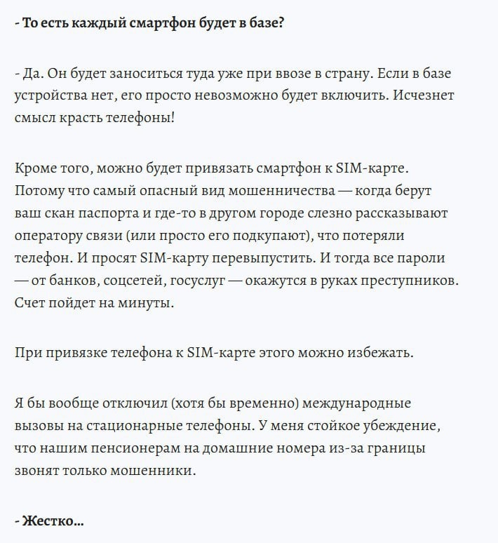 Суть инициативы: 🔴 Единый реестр IMEI — каждый телефон заносят в базу при ввозе в страну. Нет в реестре — устройство просто НЕ РАБОТАЕТ, у вас на руках кирпич. Про IMEI писали тут. 🔴 Хотят внести привязку к SIM-карте — смартфон будут жёстко связать с конкретной симкой. 🔴 Из-за этого под угрозой серые телефоны (до 70% рынка) — неофициальные смартфоны могут исчезнуть, купить у других людей поддержанные не получится, а цены у ритейлеров ВЗЛЕТЯТ. Только это нам и нужно 😱 CtrlAltDelights- подписаться