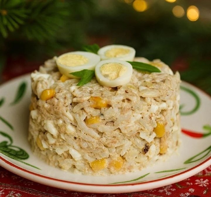 ИНГРЕДИЕНТЫ: ✅ Варёный рис — 1 стакан ✅ Консервированная рыба (тунец или любая по вкусу) — 1 банка ✅ Яйца — 3 шт. ✅ Репчатый лук — 1 шт. ✅ Консервированная кукуруза — 5 ст. л. ✅ Майонез — для заправки ✅ Соль — по вкусу ПРИГОТОВЛЕНИЕ: 1. Слить жидкость с консервированной рыбы, удалить крупные косточки и размять рыбу вилкой. 2. Яйца сварить вкрутую, остудить, очистить и натереть на крупной тёрке или мелко нарезать. 3. Лук очистить, мелко нарезать и залить крутым кипятком на 5 минут, чтобы убрать горечь. Затем воду слить. 4. В миске соединить варёный рис, рыбу, яйца, лук и кукурузу. 5. Посолить по вкусу, заправить майонезом и тщательно перемешать. 6. Выложить салат в салатницу, украсить по желанию и подать к столу. СОВЕТЫ: ✅ Вместо тунца подойдут сайра, горбуша или скумбрия в собственном соку. ✅ Чтобы салат был нежнее, используйте лук сладких сортов или красный. ✅ Рис лучше брать рассыпчатый — длиннозёрный или басмати. ✅ Можно добавить зелень, немного огурца или щепотку чёрного перца.