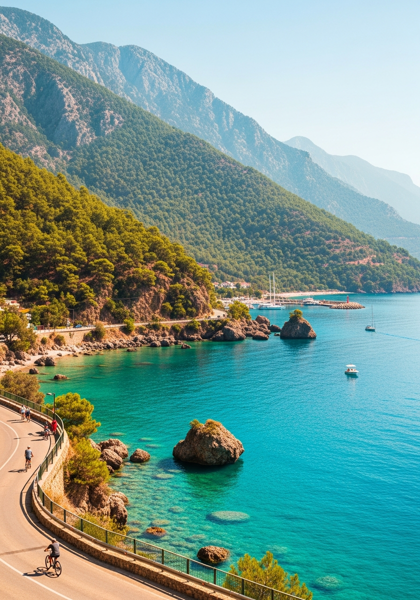 Семикилометровая променадная зона вдоль моря — идеальное место для прогулок с видом на Таврские горы и бирюзовые воды. Современная набережная утопает в зелени пальм и оливковых деревьев.