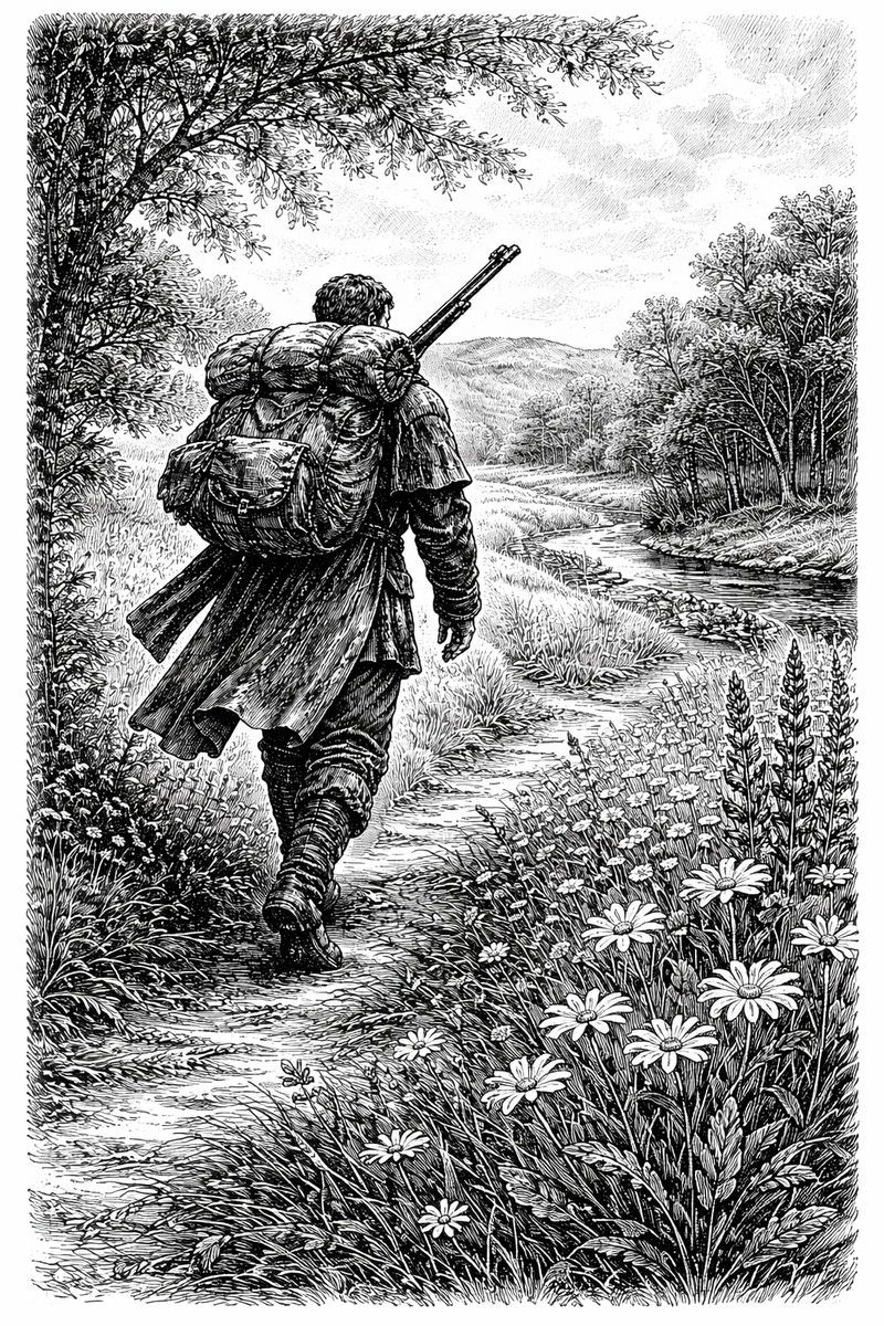 На этот раз он избегал дороги, выбрав обходной путь через луга — с полным рюкзаком за спиной и ружьём, перекинутым через правое плечо. В это время года тропа часто бывала залита водой после сильных дождей, поэтому с повозками они обычно ехали по главной дороге на север, к Уэрхэму. Но сегодня погода стояла сухая, и земля под сапогами была твёрдой, а не раскисшей.