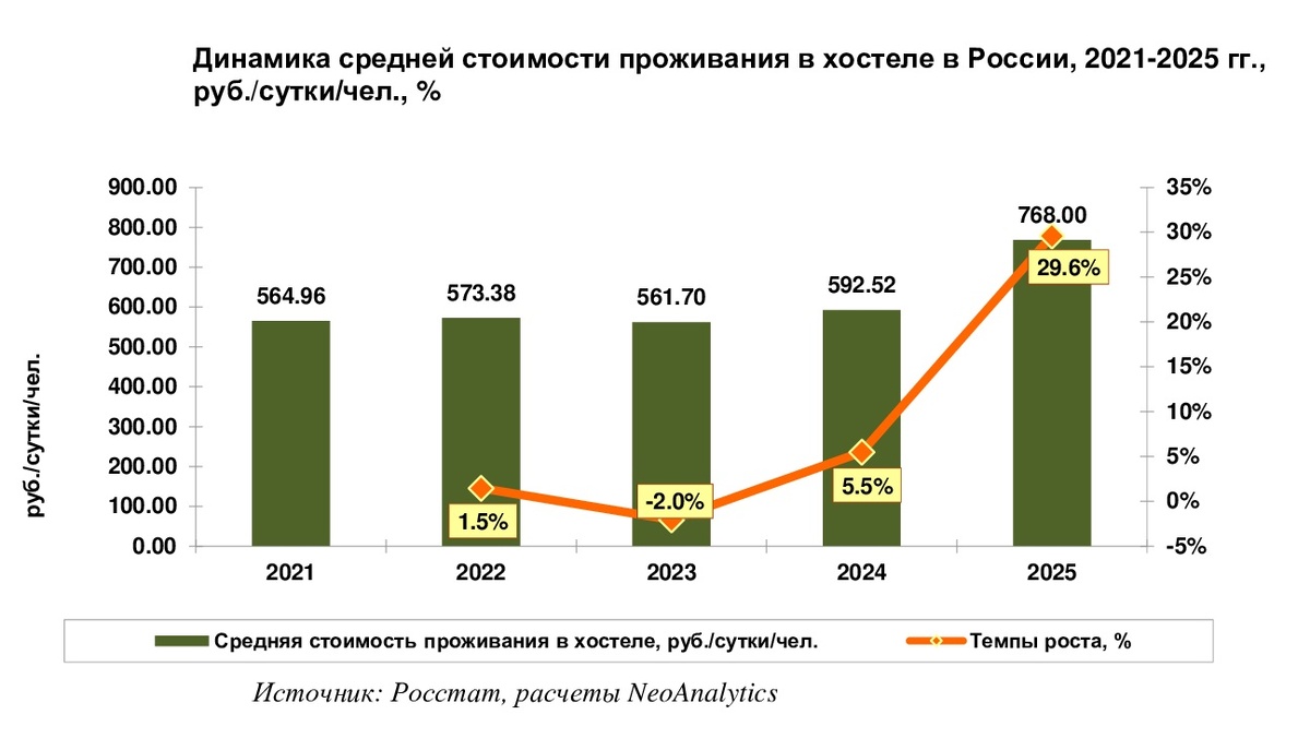 В ходе ежемесячного мониторинга средней стоимости проживания в хостеле в России, проведенного NeoAnalytics, выяснилось, что непосредственно 2025 г. произошло ощутимое подорожание проживания в данных объектах размещения в России. Так, средняя стоимость за год взлетела практически на треть по отношению к аналогичному показателю годом ранее и была зафиксирована на отметке в 768 руб. за сутки с одного человека Объектом исследования являются средние цены на проживание в хостеле в 2-10 местном номере без дополнительных услуг, в том числе капсульном. В расчете на 1 человека за сутки. Глубина бронирования: на 1 и 2 месяца вперед. Необходимо отметить, что в период 2021-2024 гг. средняя стоимость держалась практически на одном и том же уровне и критического роста цен не наблюдалось. В 2023 г. средняя стоимость даже немного сократилась. В итоге в 2025 г. средние цены на хостелы достигли своих пиков. Помесячная динамика периода 2021-2025 гг. показывает, что ситуация со средней стоимостью проживани