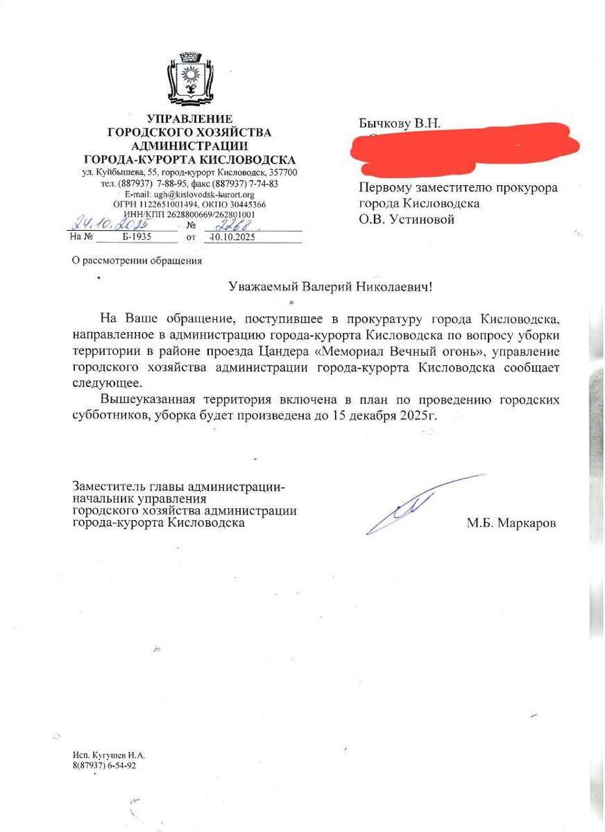 Это ответ из Администрации, что будет проведен субботник до 15.12.2025 года. Оказалось враньем!