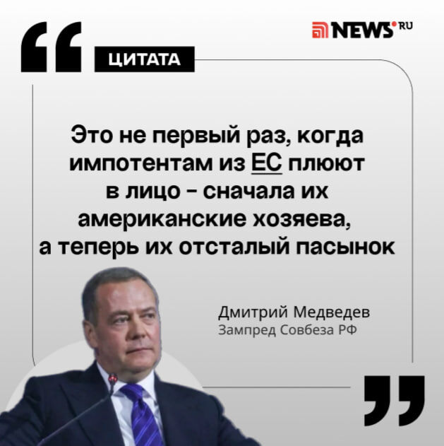 Критика, которой глава киевского режима подверг Европу, должна была обернуться для «неблагодарной наркосвиньи» поркой, но «европейским импотентам» не привыкать к плевкам в лицо, заявил зампред Совбеза РФ. На Всемирном экономическом форуме в Давосе Зеленский обвинил европейских союзников в бездействии и несамостоятельности. Он также пожаловался, что Украине нужна «подстраховка» от президента США Дональда Трампа. ⭕️ Подписаться | Мы в MAX | Буст
