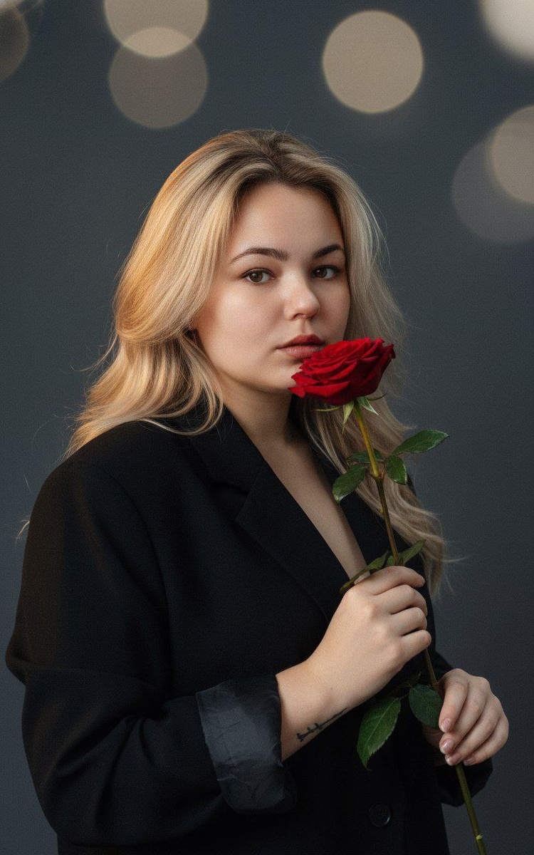 чёрном свободном пиджаке без видимой рубашки, в расслабленной позе, держит длинную красную розу у груди и губ, видна небольшая татуировка на запястье. Мягкий боковой и контровой свет с тёплыми золотистыми бликами на волосах, глубокие тени, нейтральный тёмно‑серый фон, натуральная кожа, детализированная текстура ткани и листьев розы, кинематографическая цветокоррекция (тёплые светлые тона, прохладные тени), низкая глубина резкости, объёмное боке, лёгкий плёночный грайн, спокойная элегантная композиция. Параметры камеры: full‑frame, объектив 85 мм, f/1.4–1.8, ISO 100–200, выдержка ~1/125s, высокое разрешение, natural skin tones. Негативный промпт: без логотипов/текстов, без шумов и артефактов, без искажений рук и пальцев, без лишних объектов на переднем плане. #женские@annapromtii20