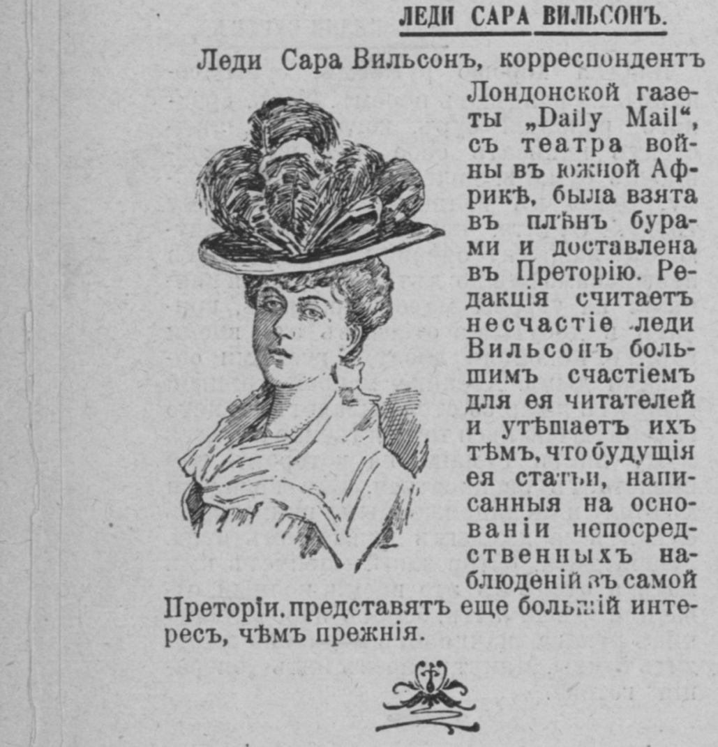 Леди Сара Изабелла Августа Уилсон (урождённая Спенсер-Черчилль) (1865-1929 гг.) попала в ЮАР вместе с мужем-военным. Вскоре началась англо-бурская война. Корреспондент одной из английских газет, который рассказывал о событиях этой войны, попал в плен. Редакция газеты связалась с Сарой и наняла ее в качестве замены. И Сара отлично справилась. Она путешествовала по окрестностям со своей горничной и интересно описывала все происходящее. Потом она попала в плен к бурам, но они ее обменяли на какого-то конокрада.