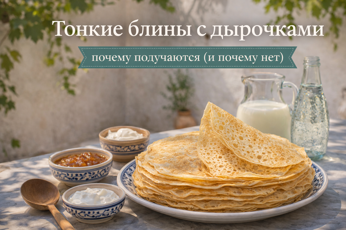 Дырочки — это не “удача” и не “магия”, а сочетание трёх вещей: температура, правильная жидкость в тесте и то, как вы его жарите. Сейчас разложу по полочкам: что именно даёт дырочки, почему иногда они не появляются, и дам рецепт тонких блинов, которые получаются реально стабильно. Дырочки появляются, когда в тесте образуются и быстро выходят пузырьки газа/пара. Это происходит, если: Поэтому самый простой путь к “кружеву” — кипяток или минералка, и правильный огонь. Признак: блин матовый, без “шипения”, печётся долго.
