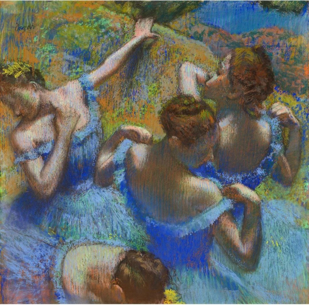 Не смогла удержаться и приобрела на выставке печатную репродукцию картины «Голубые танцовщицы» (фр. Danseuses bleues) — пастель французского художника-импрессиониста Эдгара Дега, созданная в 1897 году. Это одна из самых известных его работ и , возможно банально, но я её обожаю! Кажется, что балерины движутся по кругу в танце, но есть версия, что Дега изобразил одну модель в разных ракурсах, стараясь передать образ кружащейся танцовщицы. Мне близко именно это мнение, изображение словно находится в постоянном движении. Очень чётко видно растушевку пастели, Дега использовал особую технику обработки материала паром. Печать, кстати отличная, на льняном холсте, осталось подобрать багет) А вам нравится эта картина?