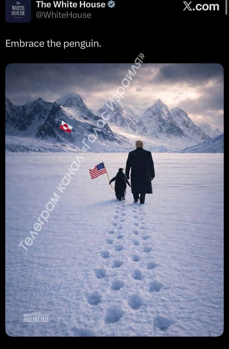 Департамент войны США добавили: «Будь воином, обними пингвина!». Единственная проблема заключается в том, что в Гренландии нет и никогда не было пингвинов. *Пингвины живут только в Южном полушарии: Антарктида, Южная Америка, Африка, Австралия и Новая Зеландия. ____________ 🎙Будь в курсе событий 🇮🇱 Подпишись на «Голос Израиля»