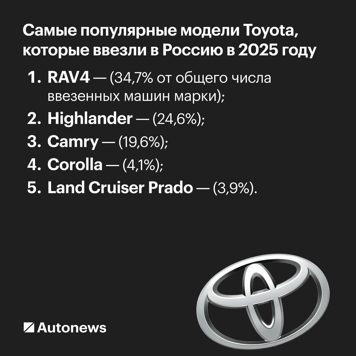 Рейтинг моделей По итогам 2025 года в Россию импортировали 127,8 тыс. автомобилей Toyota, что на 12% больше, чем в 2024 году, сообщил директор агентства «Автостат» Сергей Целиков. «При этом на новые автомобили Toyota (до трех лет) пришлось лишь четверть от общего объема импорта (30,3 тыс. шт.), но динамика тут повыше (+40%)», — отметил аналитик. По его словам, остальные ввезенные автомобили Toyota — подержанные (старше трех лет). Объем ввоза за год — 97,5 тыс. шт., а динамика по отношению к предыдущему году составила +6%. «Среди подержанных Toyota разнообразие модельного ряда очень велико. Наверху тут Corolla, Yaris, Wish, RAV4 и Raize. Далее несколько десятков разнообразных моделей. Некоторые из них совсем не привычны уху автолюбителей европейской части нашей страны», — пояснил Целиков. Среди новых автомобилей Toyota, вве Показать полностью... ____ 📢 Подписывайся 👉 Канал | Аварийка LIVE | ДТП и ЧП России 💬 Общайся 👉 Чат | Обсуждения и новости ДТП