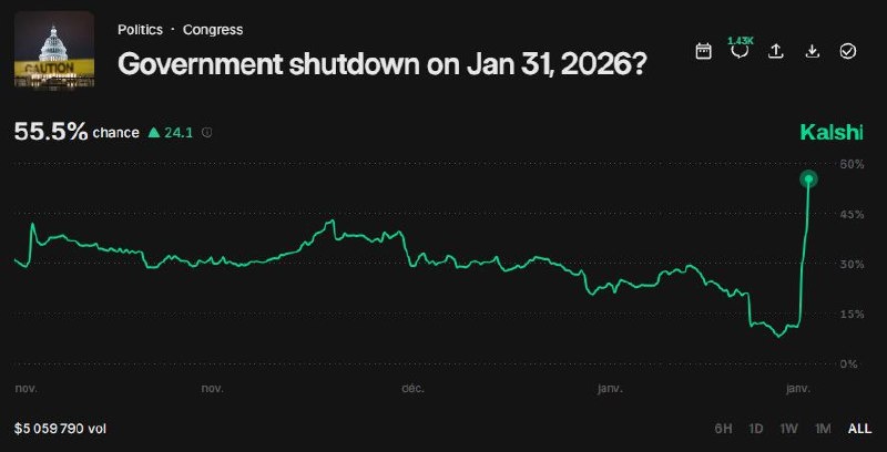 Резкий рост вероятности приостановки работы правительства США, вероятно, связан с политическими последствиями стрельбы в Миннеаполисе, которая привела к обострению борьбы за финансирование ICE и Национальной безопасности, что ставит под угрозу переговоры по бюджету по мере приближения крайних сроков @marketheart