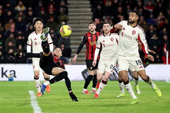 На противоположном конце поля у подопечных Ираолы что-то проклёвывалось разве что слева, где шустрил Адли. Сюда же ситуативно смещался Эванилсон, выдвинутый на острие атаки "красно-чёрных". Тем неожиданнее было, как "Борнмут" выскочил из засады в середине первого тайма. После дежурного заброса с центра поля "вишни" выбежали 2x2 к воротам Алиссона, и ван Дейк промахнулся мимо мяча, позволив Скотту от лицевой сыграть чуть назад на Эванилсона. Бразилец не пощадил "Ливерпуль" за несогласованность центральных защитников, пушечным ударом вогнав мяч в сетку, - 1:0! Ещё и Гомес до кучи по инерции влетел в Алиссона... Вскоре окрылённые успехом южане удвоили преимущество в счёте. Хилл беспрепятственно протащил мяч через полполя и отдал резкий вертикальный пас в направлении Алехандро Хименеса. Испанец обежал бывшего игрока "Борнмута" Керкеза, сблизился с Алиссоном и покатил мяч между ног первому номеру "Ливерпуля" - 2:0! Возобновлению встречи предшествовала замена в стане мерсисайдцев: Эндо поменял Гомеса. Поди разберись, реакция ли это Слота на слабую игру универсала "красных" или же оперативное вмешательство из-за возможного повреждения. Так или иначе, в конце тайма чемпион пришёл в себя, переведя игру к воротам Петровича. После удара Вирца с 18 метров мяч разминулся с дальней штангой, а уже в добавленное время гости добились своего со стандарта. После подачи Салаха от правого углового флага Эванилсон выбил мяч ещё на один корнер, и после навеса Собослаи от левого углового флажка ван Дейк опередил на ближней штанге Эванилсона - 2:1!