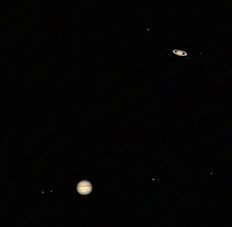 » Юпитера 🪐 и Сатурна 🪐 В декабря 2020 года произошло редкое сближение Юпитера и Сатурна на небе, известное как «великое соединение». Обе планеты оказались так близко друг к другу, что одновременно помещались в поле зрения обычного телескопа. (впечатляющий снимок этого события сделал астрофотограф Дэмиан Пич) Расстояния на тот момент: · Между Юпитером и Сатурном: 730 млн км. · От Земли до Юпитера: 886 млн км. · От Земли до Сатурна: 1,6 млрд км. Такое тесное видимое сближение этих планет происходит очень редко — предыдущий раз оно наблюдалось в 1226 году, а следующее произойдет только в 2080 году. Спокойной ночи, земляне! «Щукин и всё»