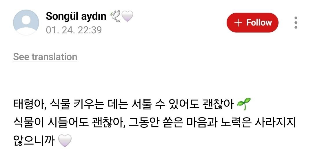 (1-2 фото) Арми: Тэхён-а, даже если у тебя не очень ладится с растениями — ничего страшного 🌱 Даже если растение завянет — ничего страшного, ведь чувства и усилия, которые ты в него вложил, никуда не исчезают 🤍 Тэхён: я этого малыша забрал всего 3 дня назад (3-4 фото) Арми: Ты же в этом новичок, поэтому и бывают неудачи, это ж у всех так, разве нет? ㅋㅋ Если понемногу практиковаться, однажды станешь профиㅎㅎ Мы ведь так и добиваемся успеха — когда учимся на ошибках и трудностях Тэхён: тогда буду очень старательным новичком #weverse @💥BANG!BANGTAN
