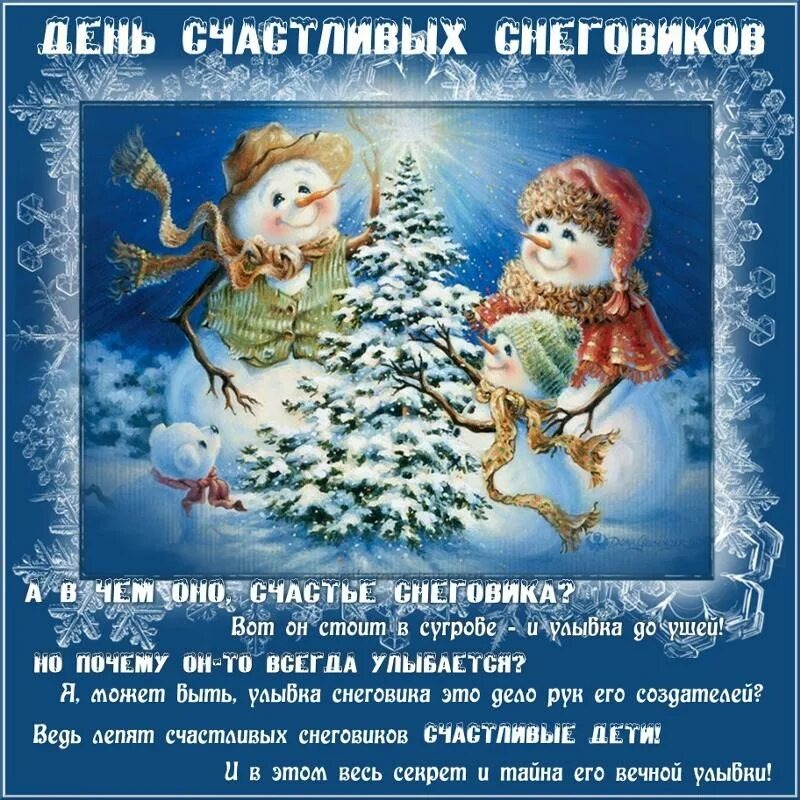 Приветствую всех заглянувших на мою страничку! Сегодня, 25 января, в Татьянин день отмечается еще и шуточный тематический праздник День счастливых снеговиков! Заметьте, что не просто каких-то снеговиков, а именно, счастливых ))) Потому что 18 января отмечался еще и просто Всемирный день снеговика... У современной пермской поэтессы Валентины Шеломовой (была номинирована на звание «Поэт года» и «Наследие») есть даже вот такое стихотворение в тему, которое так и называется "Счастливые снеговики": Сегодня День снеговиков счастливых,
