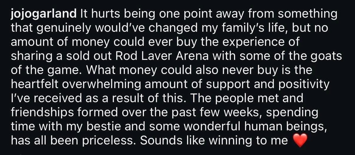 : «Было больно проиграть в решающем очке, ведь этот матч мог изменить жизнь моей семьи. Но никакие деньги не купят опыта игры на переполненном стадионе Рода Лейвера с лучшими теннисистами мира. И никакие деньги не купят той невероятной поддержки и позитива, которые я получила. Встречи с людьми, новые дружеские связи, время с лучшей подругой и удивительными людьми — всё это бесценно. Звучит как победа для меня» Подпишись на Эйс и точка