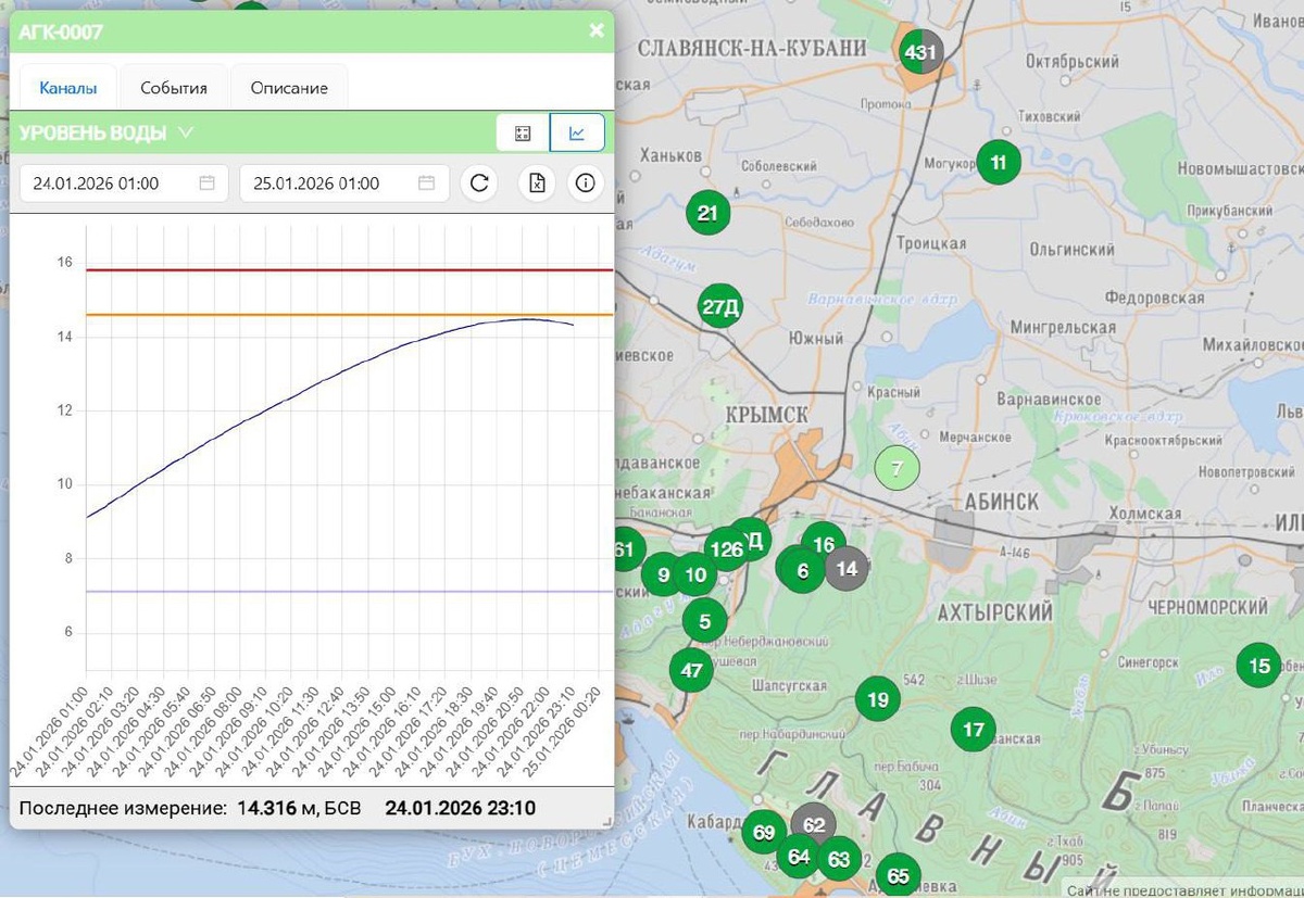 Абин Датчики фиксируют снижение уровня воды в реке Абин в Мерчанском сельском поселении. За состояние водных объектов на территории района специалисты ГО и ЧС следят круглосуточно. Скриншот с сайта Эмерсит на 23.10.