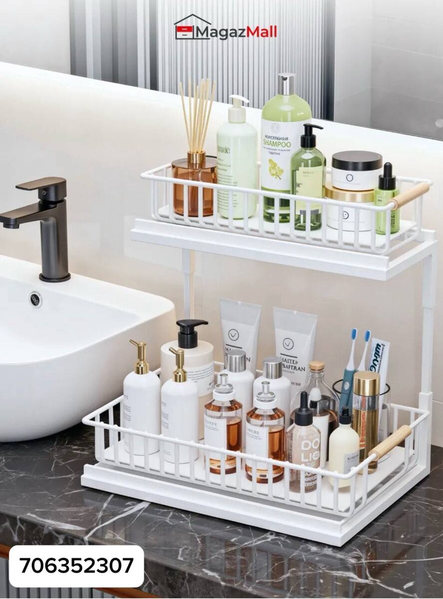 Этот органайзер — образец того, как практичная вещь может выглядеть эстетично. Металлическая конструкция с аккуратными бортиками выполнена в нейтральном белом цвете, что делает её визуально лёгкой и ненавязчивой. Два уровня хранения позволяют рационально использовать вертикальное пространство под раковиной или в кухонном шкафу.