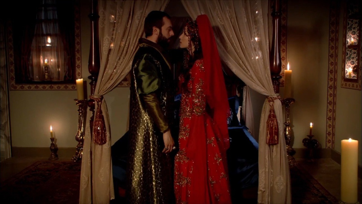Давайте вспомним одни из самых запоминающихся образов невест из любимого турецкого сериала и рассмотрим их подробнее! А в конце вы напишите, какой из образов понравился вам больше всего. Договорились? Поехали! Конечно же, мы начинаем с образа Хатидже! Она - любимая сестра султана и ее долгожданная и провокационная свадьба показана в сериале раньше других и особенно подробно, так что ее образ как невесты первым приходит на ум. И первая ассоциация - total red. Образ Хатидже полностью красный, что, на мой взгляд, абсолютно не соответствует ее нежной натуре. В светлых легких нарядах она всегда смотрелась лучше, но, поскольку свадебное платье красного цвета - это древняя османская традиция, ничего не поделаешь! Главный акцент образа - необычная красная корона, с которой свисают множество нитей с красными бусинами. Именно эта корона так запала нам в душу, что этот образ запомнился сильнее всех остальных. Султан дарит сестре на свадьбу украшения - колье и серьги с тюльпанами, которые являются